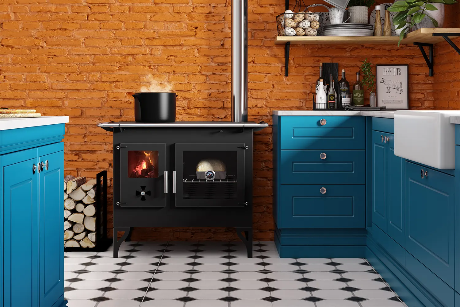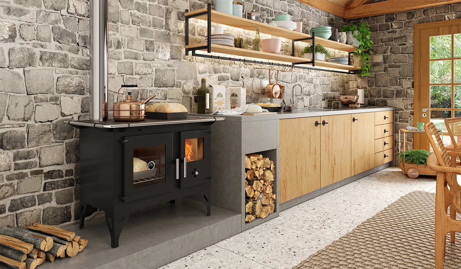 Las cocinas a leña son productos 2 en 1, ya que contemplan la misma tecnología de doble combustión que se aplica a los calefactores y además son aptas para cocinar.